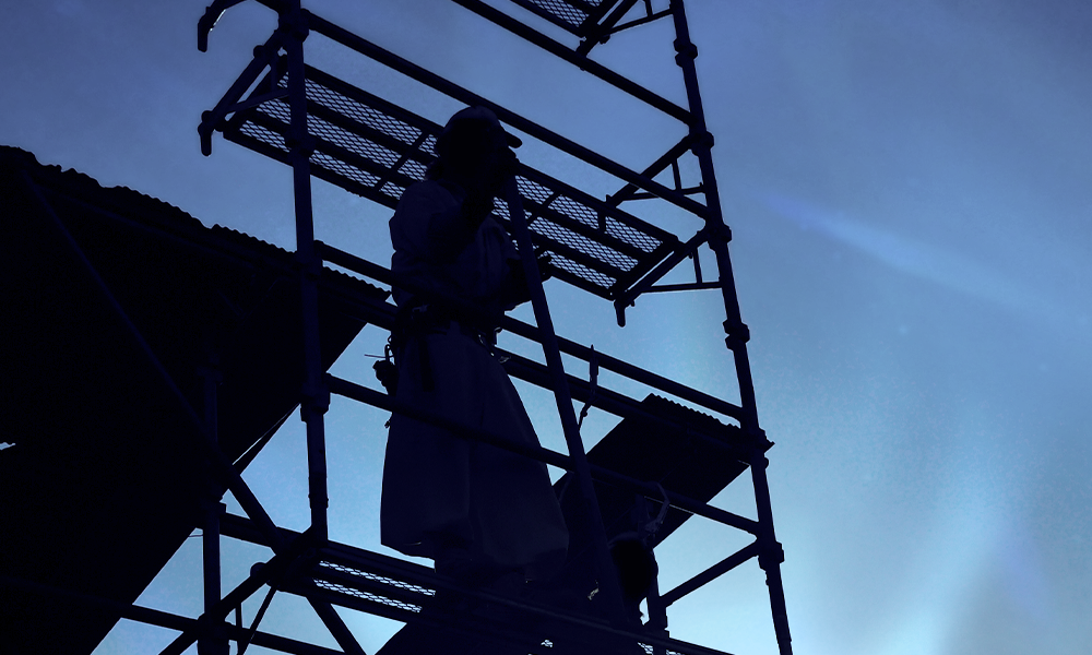 〇〇では、足場工事一式を担っております。